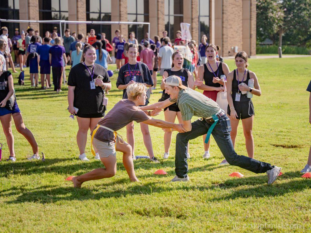 New students wrestle to grab each other’s flag during a game of flag tag in the Mentor Group Olympics. (Photo by Daniel Curd)