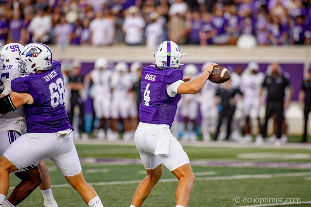 Stone Earle, redshirt senior quarterback from Fort Worth, looks for an opening to pass the ball. (Photo by Daniel Curd)