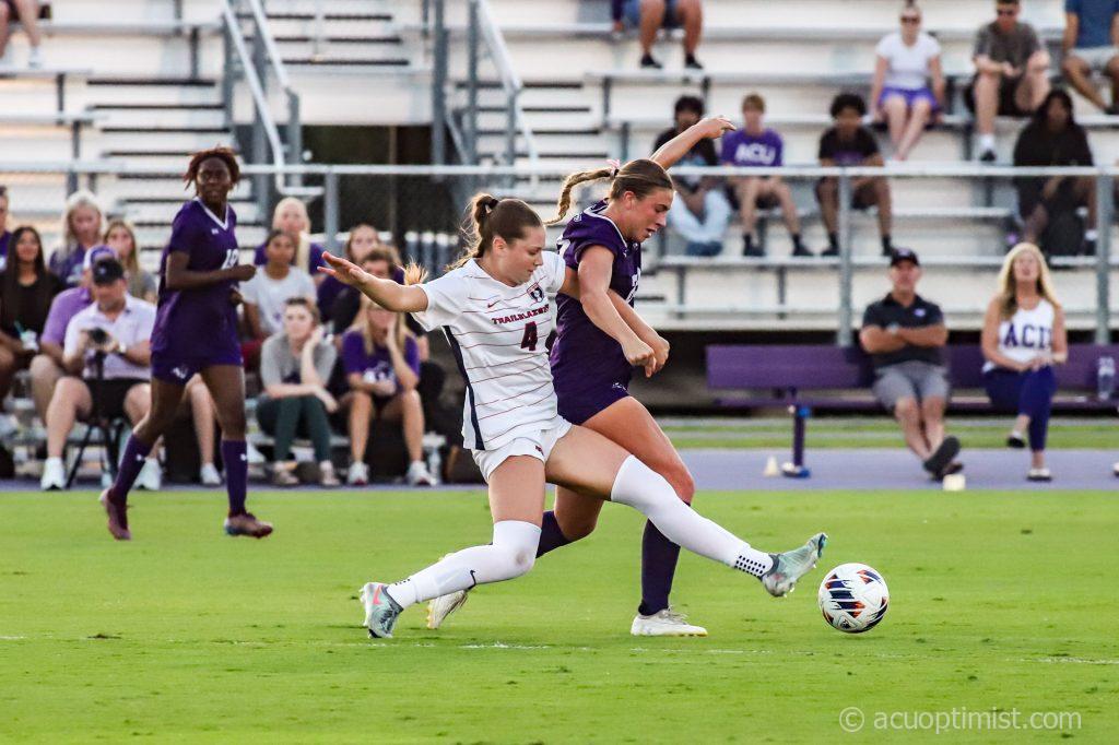 Amelia Leggett, senior forward from Wylie, fights for possession of the ball against Utah Tech’s Nicole Choren. (Photo by Steven Infante)