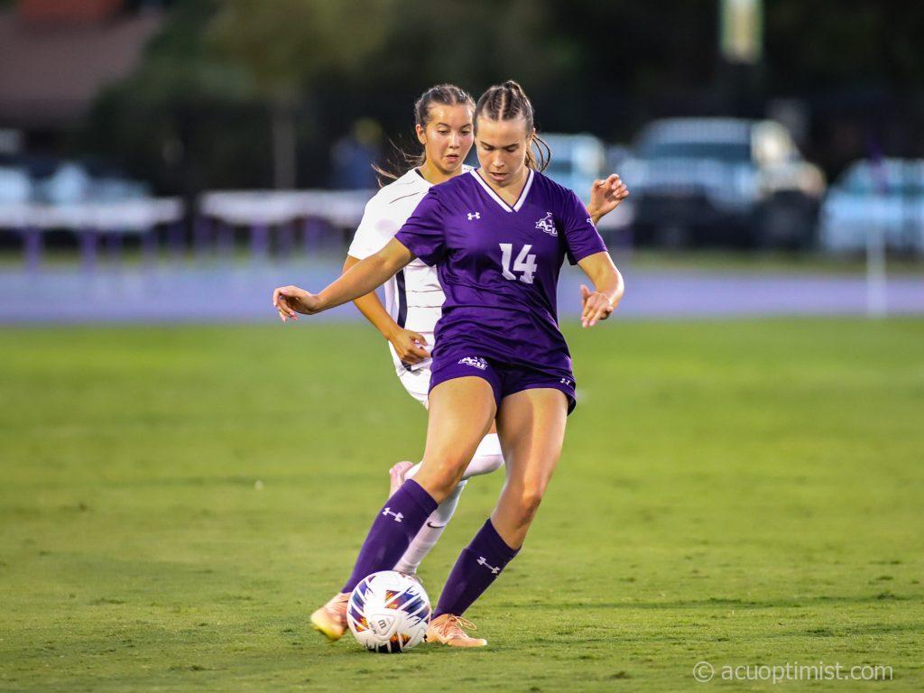 Amelia Miller, sophomore midfielder from Winter Park, Florida, defends the ball against a Utah Tech player. (Photo by Steven Infante)