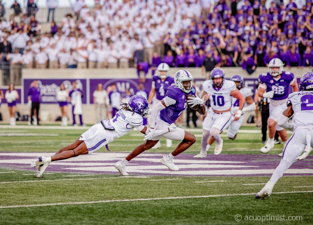 Javon Gipson, redshirt senior wide receiver from Richmond, runs with the ball, weaving through Tarleton's defense. (Photo by Naya Pacheco)