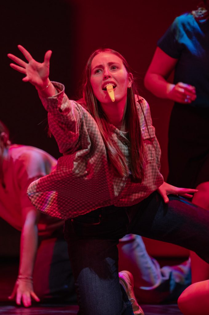 A Highbury student, played by Ella Venegoni, reaches out while playing the kazoo. (Photo by Daniel Curd)