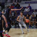 - Hunter Jack Madden, senior guard from Sydney, Australia, looks to get around UTA’s defense. (Photo by Steven Infante)