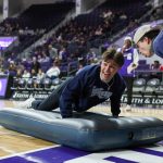 - Angel Guerrero, freshman nursing major from Temple, finishes the sliding mattress relay during halftime. (Photo by Sarah Eunyoung Thompson)