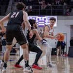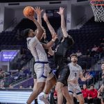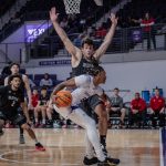 - Cade Hornecker, redshirt sophomore forward from Amarillo, makes a layup. (Photo by Daniel Curd)