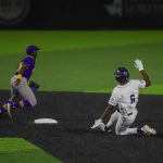 - Braden Regala, freshman outfielder from Abilene, tries to dodge a tag from an infielder. (Photo by Steven Infante)