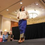 - Tyla Thompson, junior psychology major from Killeen, walks down the runway during the fashion show. (Photo by Sarah Eunyoung Thompson)