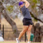 - Julia Vollmer, freshman from San Antonio, lines up a tee shot. (Photo by Daniel Curd)
