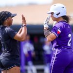- Miranda Lista, senior infielder from Chino Hills, California, high-fives Jasmine Bailey, academic graduate assistant, after running to first base. (Photo by Steven Infante)