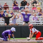 - Miranda Lista, senior infielder from Chino Hills, California, slides into home as the crowd signals safe. (Photo by Steven Infante)