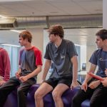 - GSP team members high-five at the end of a 50-yard freestyle race. (Photo by Daniel Curd)