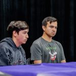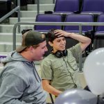 - Ethan Doyle, Fortnite team captain and freshman accounting major from San Antonio, and Cameron Traylor, Esports vice president and junior accounting major from Weatherford, commentate a main stage matchup. (Photo by Daniel Curd)