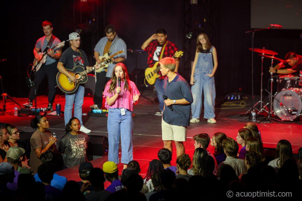 August 22, 2025 by Callie Brimberry Leave a Comment Taytum Bailey, senior management major from Lubbock, speaks encouraging words over new Wildcats in Moody Coliseum. (Photo by Callie Brimberry) Wildcat Week 2025, Late Night Worship