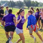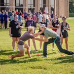 - New students wrestle to grab each other’s flag during a game of flag tag in the Mentor Group Olympics. (Photo by Daniel Curd)