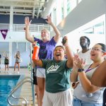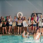 - Students line the edge of the pool to cheer on their teammates during a game of water volleyball. (Photo by Daniel Curd)