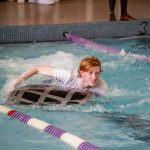- A new student swims on a mat to the end of the pool. (Photo by Daniel Curd)