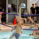 - A new student leaps and hits a backhanded spike during water volleyball. (Photo by Steven Infante)