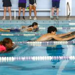 - A new student swims freestyle on a mat to the end of the pool. (Photo by Daniel Curd)