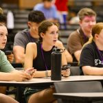 - New students discuss answers during a trivia game. (Photo by John Stai)