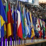 - Flags representing the countries of ACU students hang at the back of the band congregation. (Photo by Steven Infante)