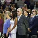 - Dr. Jeff Goolsby, director of choral studies, signals for the crowd to stand. (Photo by John Stai)