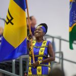 - Karen Douglas, counselor at the MACCC from Barbados, carries a flag. (Photo by John Stai)