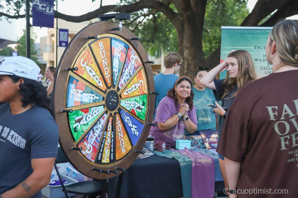 August 29, 2025 by Steven Infante Leave a Comment Members of University Church of Christ's The Crossing program let a student spin the wheel for a prize. (Photo by Steven Infante) Wildcat Week 2025, ACU Fest