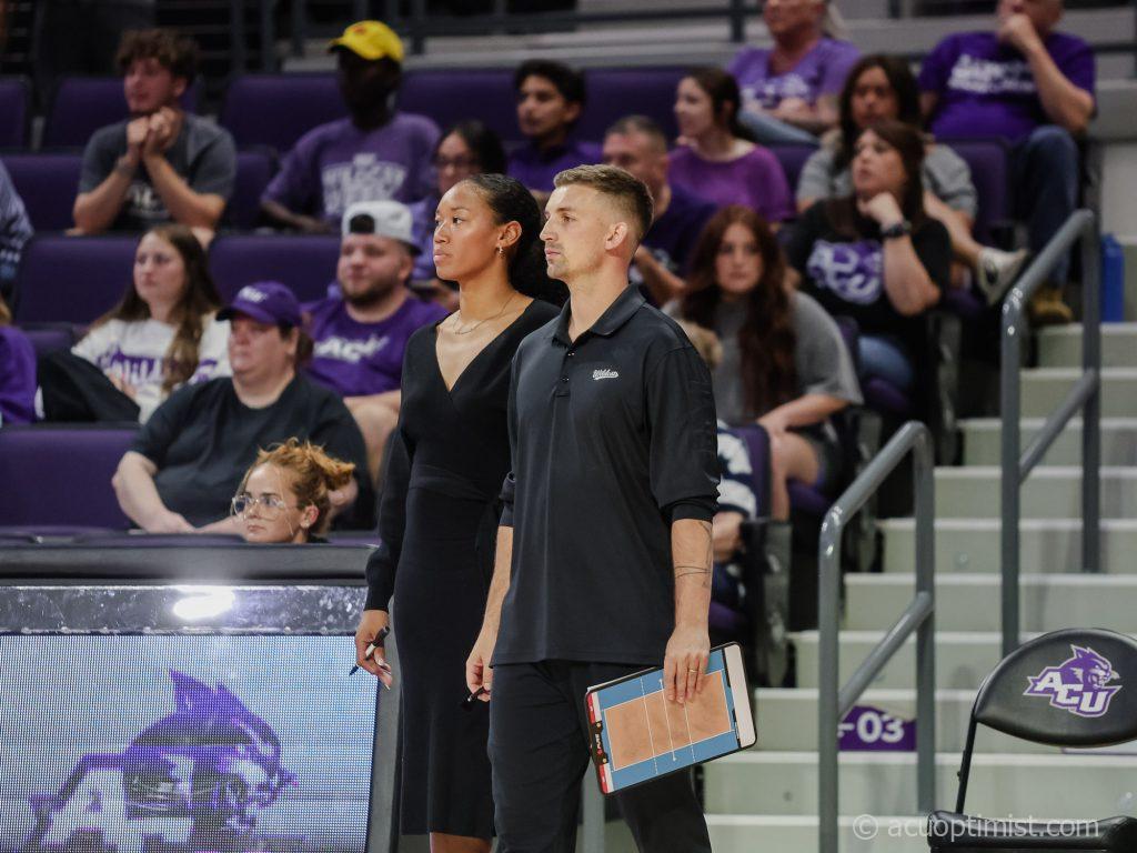 Head Coach Ijeoma Moronu Alstrup and Assistant Coach Chris Alstrup watch the rally from the sidelines. (Photo by Daniel Curd)