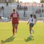- Jada Farrington, freshman defender from Leawood, Kansas, runs down the field looking to intercept the ball. (Photo by Callie Brimberry)