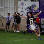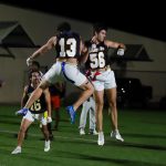 - William Jones, junior finance major from Colleyville, and Drew Adams, senior finance major from Argyle, celebrate a Galaxy touchdown. (Photo by Ashley Henderson)
