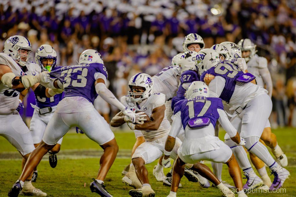 Rovaughn Banks, Jr., redshirt junior running back from Tulsa, Oklahoma, weaves past TCU’s defense. (Photo by Daniel Curd)