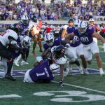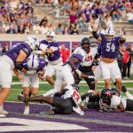 - Stone Earle, redshirt senior quarterback from Fort Worth, celebrates in the end zone. (Photo by Steven Infante)