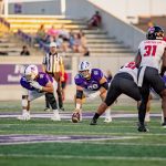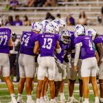 - Stone Earle, redshirt senior quarterback from Fort Worth, huddles with teammates on the field to communicate the play. (Photo by Daniel Curd)