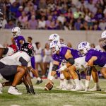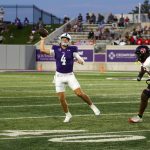 - Stone Earle, redshirt senior quarterback from Fort Worth, looks to throw the ball to the end zone. (Photo by Steven Infante)