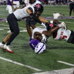 - Chris Wright, redshirt senior linebacker from Aledo, and fellow defenders tackle an opposing player. (Photo by Steven Infante)