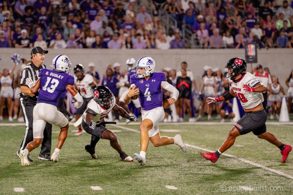 - Stone Earle, redshirt senior quarterback from Fort Worth, weaves through Austin Peay’s defense with the ball. (Photo by Daniel Curd)