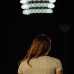 - A student sits on the field watching a spinning helmet formation during the drone show. (Photo by Daniel Curd)