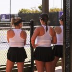 - The women’s tennis team cheers on a teammate during a match. (Photo by Callie Brimberry)