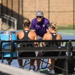 - Bryan Rainwater, head coach of the women’s tennis team, encourages his players during a match. (Photo by Callie Brimberry)