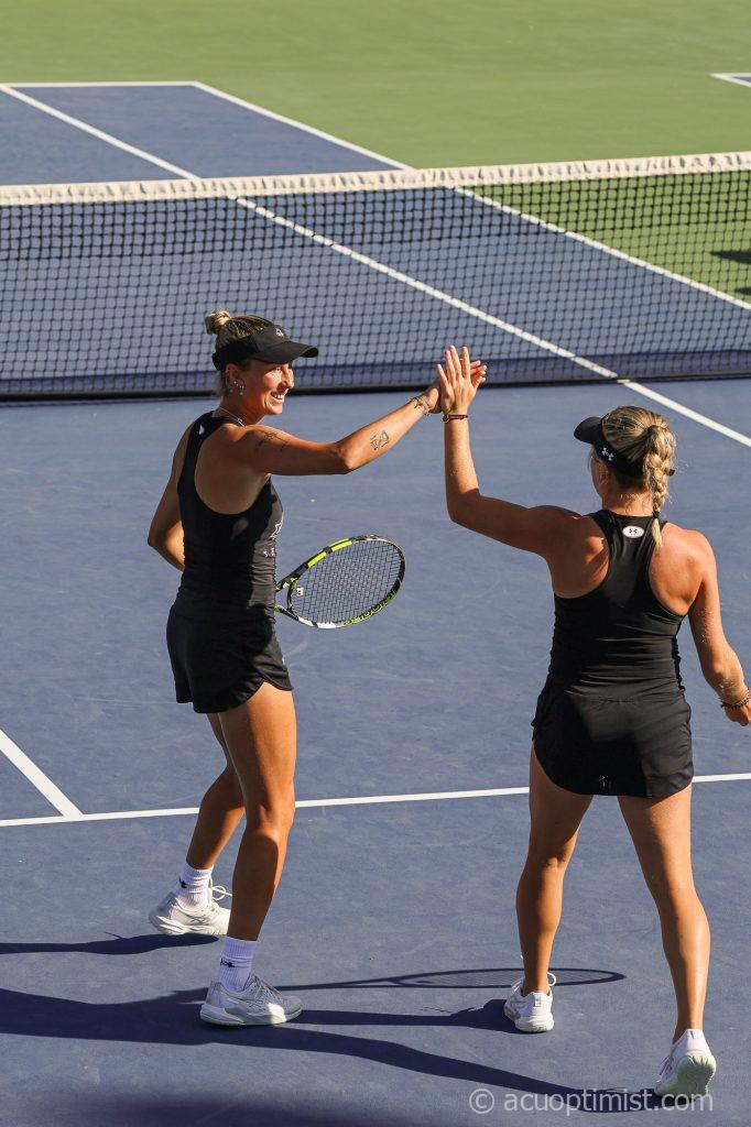 September 30, 2025 by Callie Brimberry Leave a Comment Alice Klinteby, senior from Falkenberg, Sweden, and Elsa Luthar, freshman from Betheny, France, high-five after scoring a point. (Photo by Callie Brimberry)