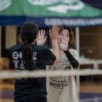 - Teammates high-five after a successful rally. (Photo by Daniel Curd)