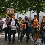 - A ‘No Kings’ protestor passes out informational ‘Know your rights’ cards in the middle of the crowd. (Photo by Ashley Henderson)