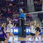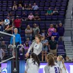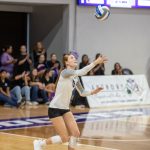 - Hadlee Welch, freshman outside hitter from Lubbock, sets the ball into the air after a teammate’s defensive play. (Photo by Steven Infante)