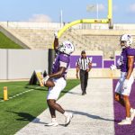 - Javon Gipson, redshirt senior wide receiver from Richmond, catches the ball for a touchdown. (Photo by Callie Brimberry)