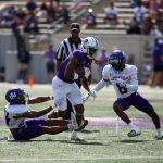- J.J. Henry, redshirt senior wide receiver from McKinney, catches a ball before being tackled. (Photo by Ashley Henderson)