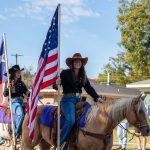 - Lillie Walthall, president of the ACU Riding Team and junior psychology major from Keller, leads the parade on horseback while carrying the American flag. (Photo by Ashley Henderson)