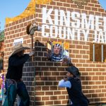 - Austin Ison, sophomore management major from Bulverde, and members of Gamma Sigma Phi act out a skit related to their Western jail float theme. (Photo by Ashley Henderson)