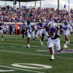 - E.J. Wilson, redshirt senior running back from Tampa, Florida, sprints down the field with the ball, weaving through Tarleton’s defense. (Photo by Daniel Curd)