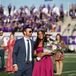 - Dr. Dennis Marquardt, associate professor of management, walks down the football field with his daughter, Makeda Marquardt, senior accounting major from Abilene and president of Ko Jo Kai. (Photo by Daniel Curd)