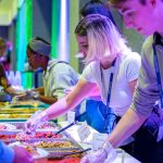 - Sofia Medina, junior graphic design major from Medellín, Colombia, volunteers to serve food at the Golden Gala. (Photo by Callie Brimberry)